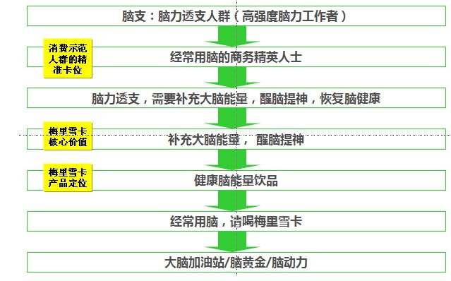 我們的策略就是借用紅牛、東鵬功效賣點(diǎn),爭(zhēng)奪“高端健康能量飲品“ 這一消費(fèi)者心智資源。借力紅牛、東鵬”困了累了“消費(fèi)者心智之力,重拳打擊紅牛、東鵬化學(xué)非健康之實(shí),提升“高端健康能量飲品“之譽(yù)。梅里雪卡要做的不是在功能賣點(diǎn)是競(jìng)爭(zhēng),而是要在此基礎(chǔ)上為消費(fèi)者多一款高端健康能量飲品的選擇,爭(zhēng)的是”高端健康能量飲品心智“之位。