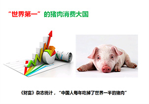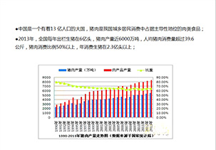 《財(cái)富》雜志統(tǒng)計(jì),“中國人每年吃掉了世界一半的豬肉”,是“世界第一”的豬肉消費(fèi)大國。豬肉是我國城鄉(xiāng)居民消費(fèi)中占據(jù)主導(dǎo)性地位的肉類食品,2013年,全國每年出欄生豬在6億頭,豬肉產(chǎn)量近6000萬噸,人均豬肉消費(fèi)量超過39.6公斤,豬肉消費(fèi)比例50%以上,年消費(fèi)生豬在2.3億頭以上。我國目前生豬肉市場規(guī)模達(dá)萬億元之最,僅廣州市每年的生豬肉銷售額就在100億以上,豬肉市場是一個潛力巨大的市場,具有“萬億級”的市場規(guī)模。