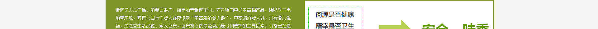 那么黑加寶的豬肉為什么是最野味香濃,最極品肉質(zhì)?這就要從黑加寶產(chǎn)品本身說起。黑加寶“四野”的養(yǎng)殖體系鑄就其極品肉質(zhì)、野味香濃;全程監(jiān)控、檢測體系及專業(yè)的配送體系讓黑加寶安全放心、品質(zhì)保證,這就是黑加寶的產(chǎn)品價(jià)值體系。