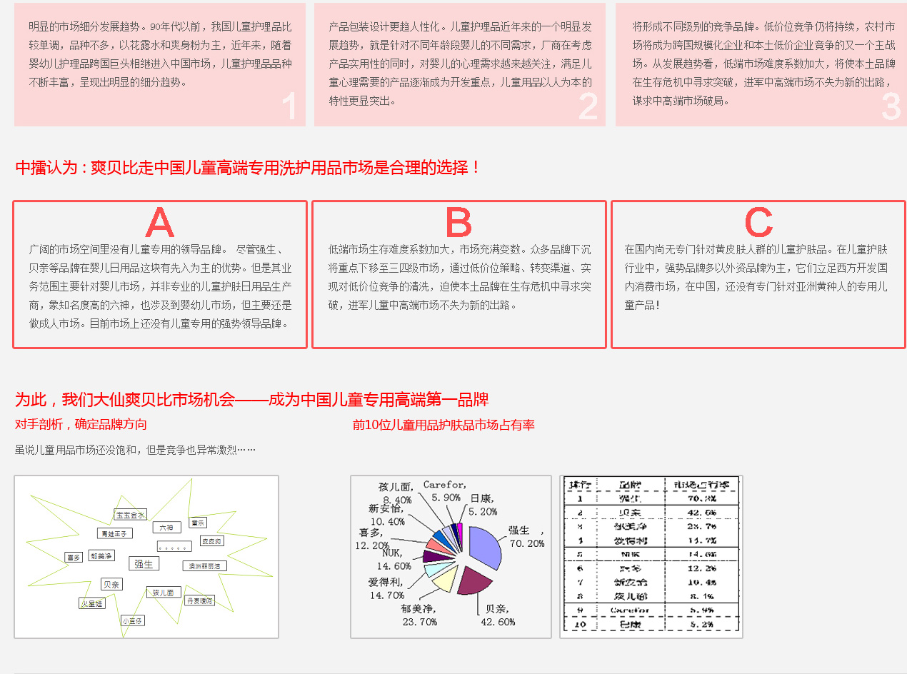 消費(fèi)者在更多時(shí)候只會(huì)認(rèn)“第一”。而品牌定位的本質(zhì):就是讓品牌在顧客的心智階梯中占據(jù)最有利的位置,使品牌成為某一個(gè)類別或某種特定需求的代表品牌。爽貝比要在綠色護(hù)膚的概念中,創(chuàng)造出“兒童水果護(hù)膚”的新理念,并快速占領(lǐng)這一品牌的致高點(diǎn);成為天然水果護(hù)膚的領(lǐng)導(dǎo)者品牌!