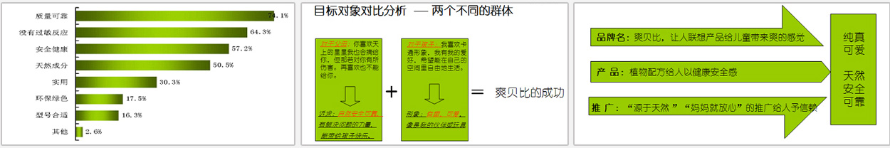 目標(biāo)人群描述:22-40歲,她(他)們是孩子的家長(zhǎng)(尤其是母親),她們對(duì)于她們來(lái)說(shuō),有可支配的經(jīng)濟(jì)能力, 價(jià)格不是問(wèn)題,產(chǎn)品質(zhì)量才最重要,她們?cè)谫?gòu)買更注重品牌知名度高低和產(chǎn)品質(zhì)量的優(yōu)越性上。在各種“問(wèn)題門(mén)”事件的影響下,選擇兒童產(chǎn)品更是慎之又慎。