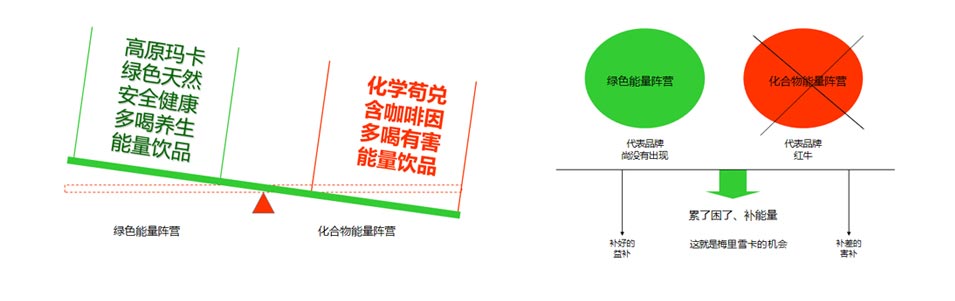 能量飲品功能訴求心智己基本成形,要調(diào)整消費(fèi)者心智己不大可能,我們要做的就是順勢(shì)而為!巧借豪奪!