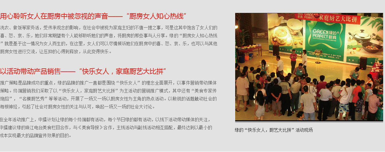 據(jù)調(diào)查了解,一個(gè)家庭主婦,每天約有四分之一的時(shí)間在廚房里度過,專職太太花費(fèi)的時(shí)間甚至更多,因此,中擂建議,綠的鍋具把關(guān)心女人廚房生活的質(zhì)量,女人們廚房的喜、怒、哀、樂作為自己的品牌使命,體現(xiàn)綠的承擔(dān)“關(guān)心女人”的責(zé)任,提高品牌形象。中擂通過對(duì)1000多名家庭主婦的調(diào)查了解后,從女人的角度出發(fā),發(fā)出的“體貼女人、理解女人”號(hào)召,做女人的知心朋友,學(xué)會(huì)聆聽她們的聲音。廚房的事依舊是雞毛蒜皮的事,可是綠的讓它變得不再無人問津,不再平淡如水。正是綠的,為女人著想,從理解、關(guān)心、愛護(hù)廚房中的女人角度出發(fā),提出“讓女人在廚房中快樂起來”的品牌核心主張,成功與國(guó)內(nèi)自主品牌甚至國(guó)際高端品牌區(qū)分開來。