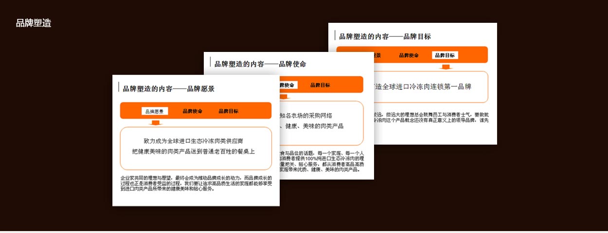 通過(guò)上面的分析,中擂基本上確定了富臨美達(dá)即將要走的方向——搶占全球進(jìn)口冷凍肉連鎖第一品牌的位置,以純進(jìn)口、原生態(tài)、口感好為產(chǎn)品概念,以社區(qū)廚房、貼心服務(wù)為品牌概念,以全球進(jìn)口生態(tài)冷凍肉類(lèi)產(chǎn)品第一品牌為品牌發(fā)展方向。致力成為全球進(jìn)口生態(tài)冷凍肉類(lèi)供應(yīng)商,把健康美味的肉類(lèi)產(chǎn)品送到普通老百姓的餐桌上。