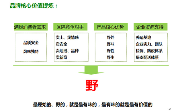 品牌核心價(jià)值首先是滿足目標(biāo)群體的價(jià)值追求,其次要規(guī)避競爭品牌的價(jià)值訴求,最后是自身產(chǎn)品的支持和品牌形象的傳承。中擂策劃團(tuán)隊(duì)結(jié)合消費(fèi)者需求、避開競爭對手訴求,突出產(chǎn)品優(yōu)勢,發(fā)揮企業(yè)資源,最終將黑加寶的核心價(jià)值提煉為“野”,最原始的、野的,就是最有味的,最有味的就是最有價(jià)值的。