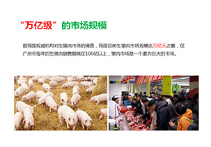 《財(cái)富》雜志統(tǒng)計(jì),“中國人每年吃掉了世界一半的豬肉”,是“世界第一”的豬肉消費(fèi)大國。豬肉是我國城鄉(xiāng)居民消費(fèi)中占據(jù)主導(dǎo)性地位的肉類食品,2013年,全國每年出欄生豬在6億頭,豬肉產(chǎn)量近6000萬噸,人均豬肉消費(fèi)量超過39.6公斤,豬肉消費(fèi)比例50%以上,年消費(fèi)生豬在2.3億頭以上。我國目前生豬肉市場規(guī)模達(dá)萬億元之最,僅廣州市每年的生豬肉銷售額就在100億以上,豬肉市場是一個潛力巨大的市場,具有“萬億級”的市場規(guī)模。