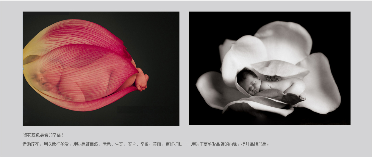 中擂以蓮花做為品牌圖騰,提煉蓮花的精神理念,做為孕愛品牌的形象價(jià)值聯(lián)接點(diǎn)!將蓮花描述成一個(gè)舒適搖籃。被花瓣包裹的孩兒,可以安全入睡。體現(xiàn)出孕愛簡(jiǎn)約、時(shí)尚、安全的調(diào)性。